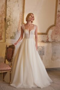 Göz alıcı kabarık eteklerin özel çiçek motifleriyle adeta dans ettiği tasarımlar gelinleri bir masal prensesine dönüştürüyor.