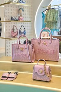Modaevinin kodları arasındaki Greca Goddess çanta ve aksesuarlar, yeni pastel renkleriyle koleksiyonda yerini alıyor. Klasik Versace hobo çanta, yeni boyutları, yeni tokası, metalik deri ve kristal detaylarıyla dikkat çekiyor.