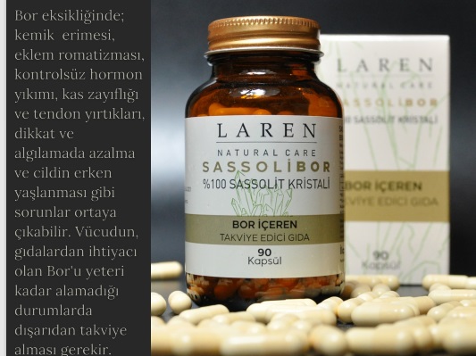 LAREN NATURAL CARE’in patentli borlu etken maddesi %99 Sassolit içeriyor. İtalya’nın Toskana bölgesinde, volkanik bölgelerde yerdeki çatlaklardan buharla karışmış olarak bulunan Sassoliti biz sentetik olarak elde ettik,: ürünlerimizde kullanıyoruz.