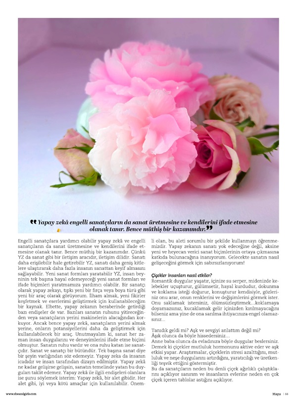 Engelli sanatçılara yardımcı olabilir yapay zekâ ve engelli sanatçıların da sanat üretmesine ve kendilerini ifade etmesine olanak tanır. Bence müthiş bir kazanımdır. Çünkü YZ da sanat gibi bir iletişim aracıdır, iletişim dilidir. Sanatı daha erişilebilir hale getirebilir YZ, sanatı daha geniş kitlelere ulaştırarak daha fazla insanın sanattan keyif almasını sağlayabilir. Yeni sanat formları yaratabilir YZ, insan beyninin tek başına hayal edemeyeceği yeni sanat formları ve ifade biçimleri yaratmamıza yardımcı olabilir. Bir sanatçı olarak yapay zekayı, tıpkı yeni bir fırça veya boya türü gibi yeni bir araç olarak görüyorum.
